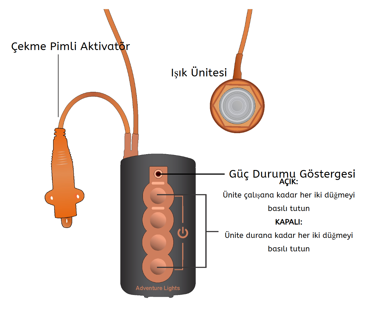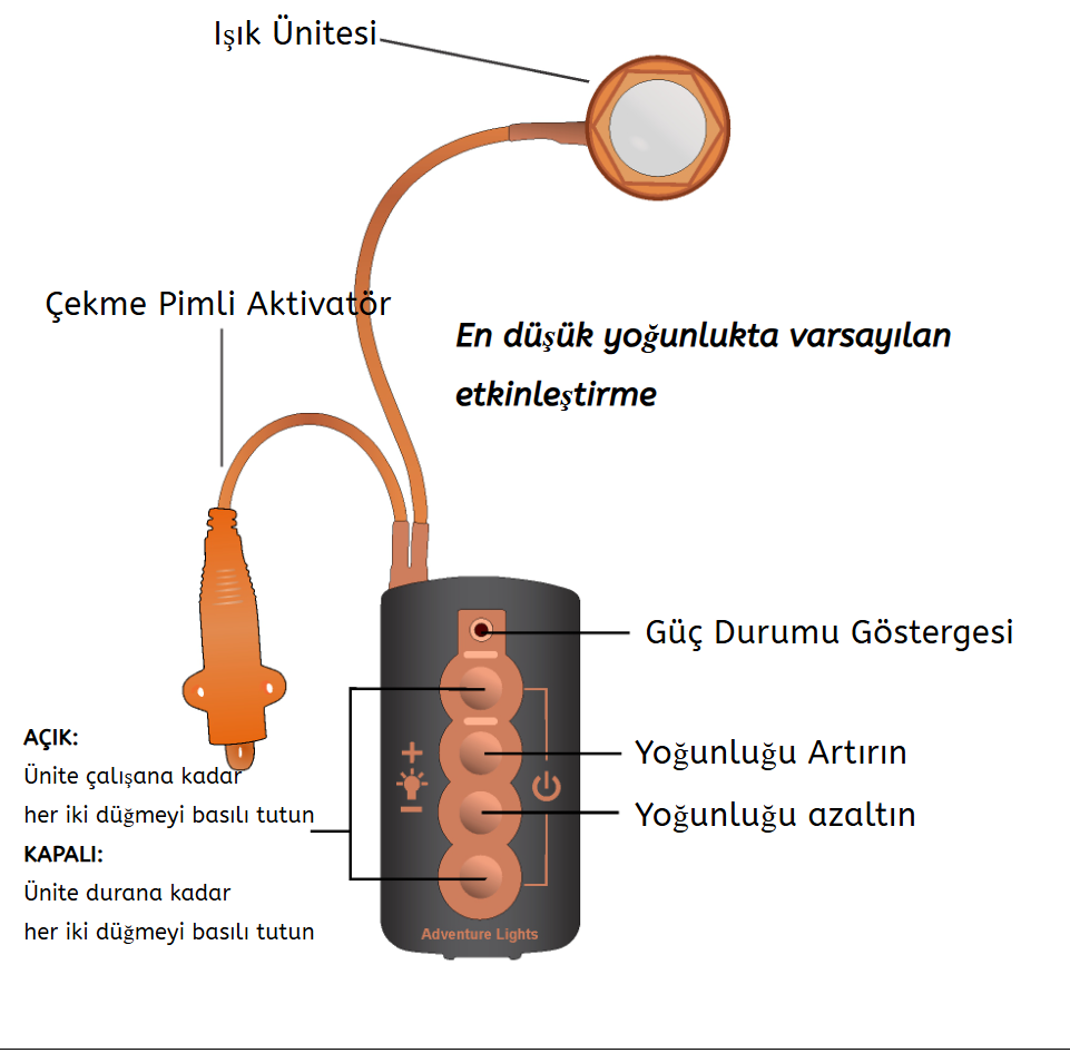 Lighthouse® Dış Can Salı Lambası, can salı şişirildiğinde ünitenin otomatik olarak devreye girmesini sağlayan patentli bir çekme pimli aktivatöre sahiptir. Kullanıcı tarafından değiştirilebilen AA pillerle çalışır.